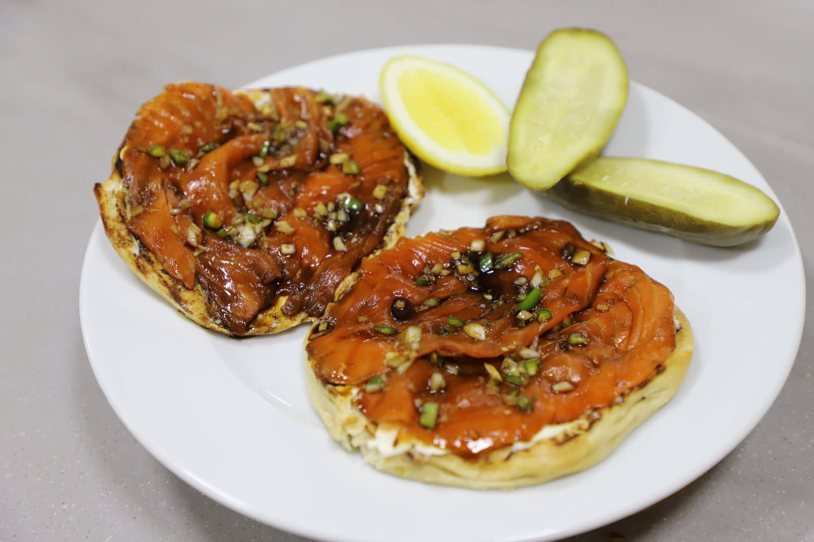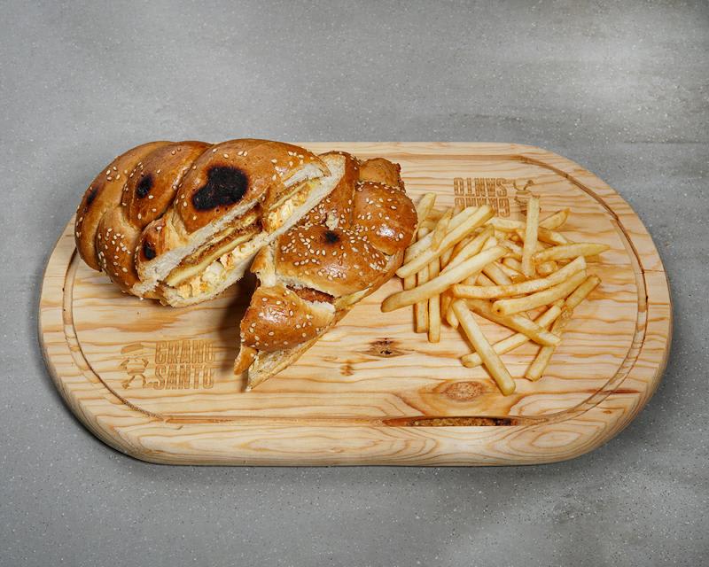 Crujiente pollo empanizado servido en pan Jalá con hummus y col israelí.