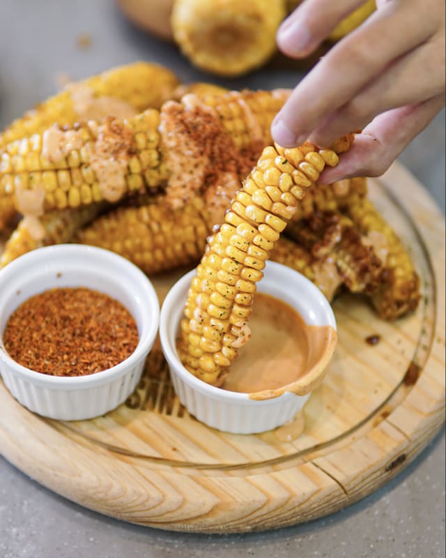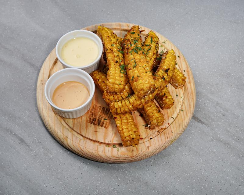 Costillas de elote cortados en cuartos asados acompañados con nuestras deliciosas salsas de mayonesa con chipotle de chilli flakes y limón amarillo.