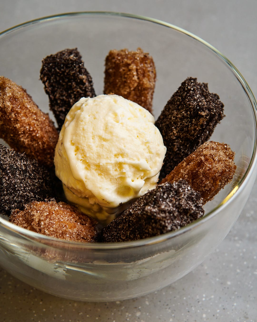 La combinación perfecta: churros de Oreo y churros tradicionales acompañados con helado de vainilla y spread de nutella, cajeta y lechera.